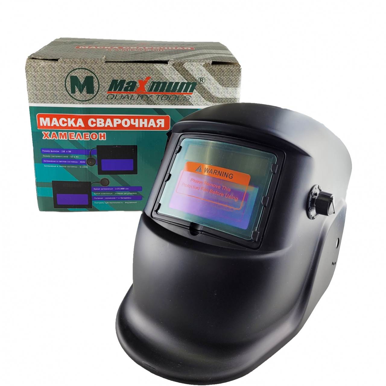Самая популярная маска сварщика — «хамелеон», которая обладает с высокими потребительскими характеристиками и внутренним контролем чувствительности при относительно небольшой стоимости. Время затемнения 1/25 000 сек. Автоматический затемняющийся светофильтр «Хамелеон» 110-90 мм с плавной регулировкой обеспечивает идеальную защиту глаз сварщика от светового излучения в видимой части спектра. Задача маски – защита от брызг расплавленного металла, защита от Уф/ИК лучей. Размер смотрового окна 93-43 мм. Источник питания автоматической маски для сварки - солнечные элементы +LI батарейки.
